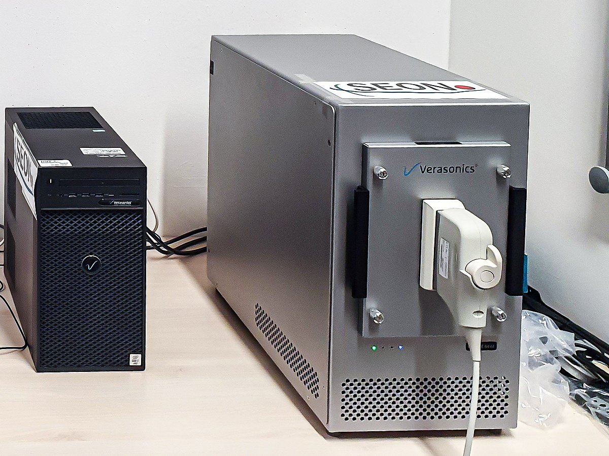 The "Vantage 64 LE" is a research ultrasound device from the company Verasonics. While in medically used systems the raw data is already displayed processed (B-scan, color Doppler, etc.) and it is not so easy to access the raw data, the Vantage system offers the possibility to access the raw data, to program the imaging itself and also to influence the sending and receiving of the ultrasound signal.