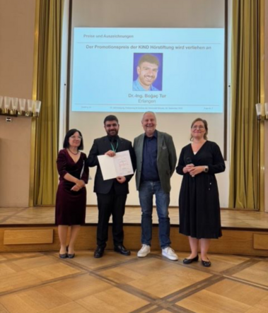 Herr Dr.-Ing. Bogac Tur hat auf der 41. Jahrestagung der DGPP (Deutsche Gesellschaft für Phoniatrie und Pädaudiologie) am 26.09.2025 in Münster den Promotionspreis der KIND Hörstiftung 2025 für seine Arbeit "Experimental investigation of multiphase flow and acoustics during voice production" verliehen bekommen. Mit dem Preis wird die beste Dissertation im Fach der Phoniatrie und Pädaudiologie geehrt.